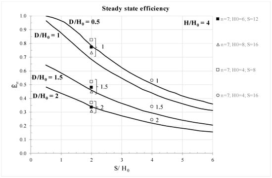 To this aim, the Ē values achieved through the new modeling (Figure 10) have been compared with those reported by Desideri et al. [] for steady-state conditions, in Figure 13, whose notation is the same as that shown in Figure 3a. The new seepage calculations implemented the same boundary conditions at the ground surface used by Desideri et al. [], i.e., the presence of a permanent film of water at u = 0, and an initial water table at the ground level, i.e., hw0 = D (Figure 10). The results plotted in Figure 13 refer to different depths D: H0, 1.5H0, and 2H0 for both models. In particular, it must be highlighted that in the figure Ē is the average over a distance equal to S (Figure 10); for the new modeling, Ē has been averaged over a horizontal segment S, of depth D, below the center of the trench system. The comparison seems to suggest that accounting for more realistic conditions in the modeling results in a higher Ē value for D/H0 = 1, whereas this is not the case for Ē at depths larger than H0. Furthermore, the results make evident that Ē does not depend only on S/H0; rather, the dependency of Ē on the trench system geometry, S, H0, n, is more complex.