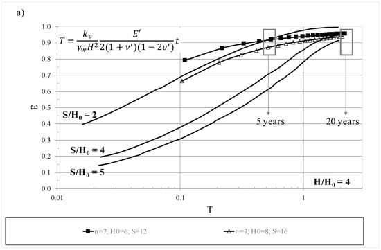 Di Maio et al. [], reported results of 2D transient seepage analyses, complying with the same geometric and hydraulic calculation scheme in Figure 3a, for D/H0 = 1 (initial water table at ground level), and when two different boundary conditions are implemented at the top of the model: impervious boundary (Figure 14a), or permanent film of water (Figure 14b). In both cases, the efficiency values are plotted with respect to a normalized time T, which varies linearly with the saturated coefficient of permeability, the soil elastic stiffness moduli, and time []. Figure 14a,b reports also the results of the new modeling (Figure 10) for two drainage trench systems, both of S/H0 = 2, still assuming the initial water table at the ground level. The comparison shows that for impervious top boundary (Figure 14a), the new model predicts Ē values smaller than those previously expected, but this is not the case when water is available at the ground surface (Figure 14b), that is a more cautious design condition.