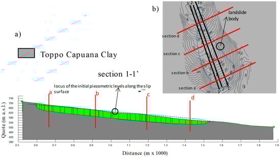 Plan of the Fontana Monte landslide at Volturino, with location of both the longitudinal and the cross sections (a); Longitudinal section 1-1′, as implemented in the numerical code (b).