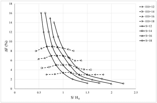 To start with, a stability factor increment, ΔF, equal to 14% is reached for section 1-1′ after installation of a drainage trench system characterized by n = 3, S = 18 m and H0 = 22 m (S/H0 = 0.82), whose plane of symmetry coincides with the section. Given n = 3, Figure 20 outlines the variability of ΔF with S/H0 for the section 1-1′; in the plot, the contours of constant S (dashed lines) and constant H0 (solid lines) are indicated. ΔF is found to increase mostly with increasing H0, in accordance with the increase in Ē discussed before. Furthermore, Figure 21 shows that the increment in stability factor increases with the number of trenches, due to the group effect, although the increment obtained passing from n = 5 to n = 7 is significantly lower than that calculated with the increment of n from 3 to 5.