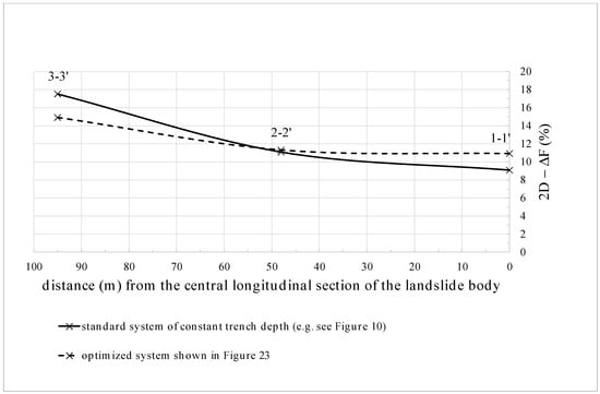 The corresponding 2D-ΔF are reported in Figure 22, for comparison with the previous results. The comparison shows that the average stability factor obtained through this kind of drainage trench system, ~13%, is comparable to that reached with a standard system, of constant S and H0, but the system in Figure 23 is more sustainable, both in terms of costs and construction effort.