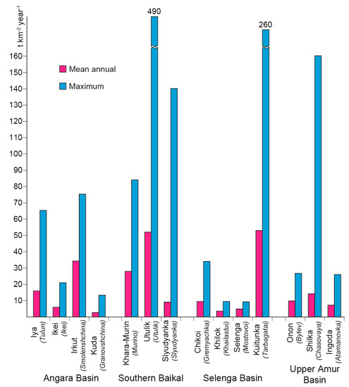 The basins of Transbaikalia (Selenga and Upper Amur) are characterized by approximately identical distribution of moduli of suspended sediment yield. Basins with extremely high sediment yield stand out against the background of relatively low values of this indicator (5–10 t/km2 per year), typical of most rivers (see Figure 2). Within the Selenga basin, it is the Kuitunka basin (see Figure 2), where mudflows, gully erosion, and intensive flushing from croplands are periodically observed [33,34]. In the upper part of the Amur basin, the Shilka basin stands out (Figure 2), which is characterized by periodically recurring extreme geomorphological events associated with monsoon rains, manifested in the activation of erosion and channel processes that move a large amount of sediment in the basin.