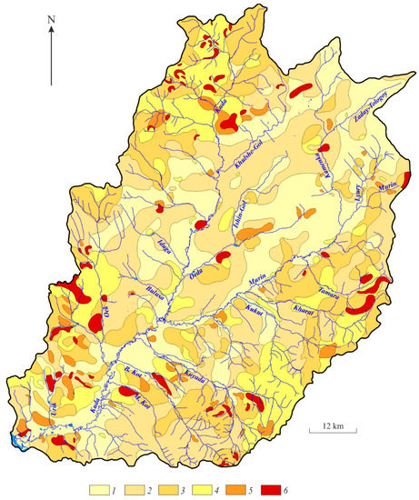 Erosion zoning of the Kuda basin. Zones: 1. no erosion hazard (loss less than 1 tha per year); 2. Weak erosion hazard (loss 1–2.5 tha); 3. Moderate erosion hazard (2.5–5 tha); 4. Medium erosion hazard (loss 5–10 tha); 5. Strong erosion hazard (10–20 tha); 6. Extreme erosion hazard (loss more than 20 tha per year).