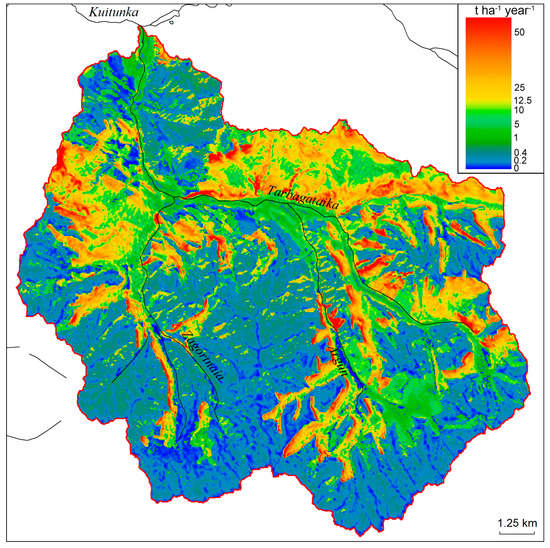 The Tarbagataika basin (the left tributary of the Kuitunka river) is characterized by a high erosion potential of the relief, typical of the Selenga highlands. The values of potential soil loss, calculated according to the RUSLE model, are extremely unevenly distributed across the basin. They reach the highest values on cultivated lands (croplands and fallow lands) located on slopes (up to 113.38 t/ha−1 per year−1), with average values for the whole basin of 7 t/ ha−1 per year−1; the smallest values correspond to forested areas (not more than 1 t/ha−1per year−1) (Table 3) (Figure 4).