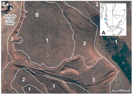 Erosion belts scheme for the area, adjusting to the Unga Bay of the Bratsk Reservoir. (A). Location of the area (marked with a blue square), (B). Erosion belts: 1. splash erosion, 2. Rill erosion, 3. Gully erosion. Based on the satellite image Google Earth. Coordinates: 53°43′37.16″ N; 102°49′33.56″ E. The image was taken on 4 October 2019.