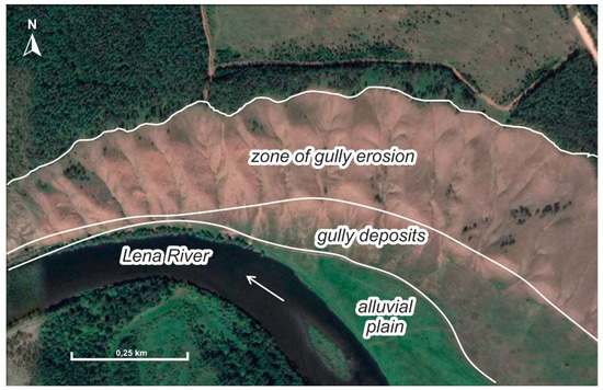 A large number of erosion forms per unit area (25–50 units/100 km2) deeply cut with a V-shaped transverse profile were recorded on the ledges of the high basement terraces of the Lena river near the settlement of Kachug (Figure 6).