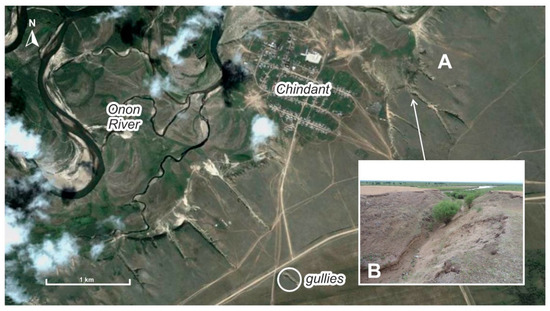 Stretch of the Onon river valley. Coordinates: 50033′44.29″ N; 115023′32.13″ E. The terrace cut with gullies (A). The image was taken on 8 March 2019. (B) Image of the gully (taken on 16 August 2015), its location is shown with the arrow.