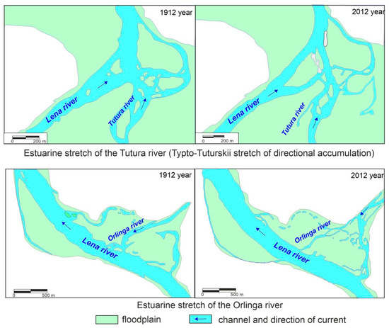 The entrenched channel type is characteristic of the Lena river valley section located within the Lena-Angara uplift of the Irkutsk amphitheater [47] at the regional level. We analyzed changes in the morphological elements of the channel from the mouth of the Tutura river to the mouth of Turuka over a 100-year period and revealed three sections with different erosion-accumulative components. The area with directed accumulation coincides with the Typto-Tuturskii declivity, the area with balanced erosion-accumulative processes coincides with the antecedent area of the valley, and the relatively stable area without obvious signs of plane channel deformations with the arcuate bed of the Lena river valley. Stretches where the processes of accumulation and erosion compensate each other occupy the largest part (138 km) of the investigated part of the Lena channel. Further along the distribution scale, there are stretches with a predominance of accumulation processes (130.1 km), almost 20 km of which are local areas with accumulative processes only in the mouths of tributaries. They are followed by unchanged (stable) stretches, occupying 50.9 km, as well as an area with a predominance of erosion processes (occupying 15 km). The estuarine stretches of large tributaries, as well as branched sections of the Lena river channel, naturally underwent the most noticeable plane channel deformations. Thus, within the mouth section of the Tutura river (Figure 8), we registered the death of the floodplain and secondary shallow by-channels, and the formation of new islands with an increase in their total area by 0.25 km2. At the mouth of the Orlinga (Figure 8), on the contrary, there is a predominance of erosion processes over accumulative ones. Here, we recorded a decrease in the number of islands, their erosion, fragmentation, and formation of new channels. The nature of the trend of plane channel deformations within the site under investigation is associated with the natural development of channel forms due to the geological, geomorphological, and hydrological conditions of the territory.