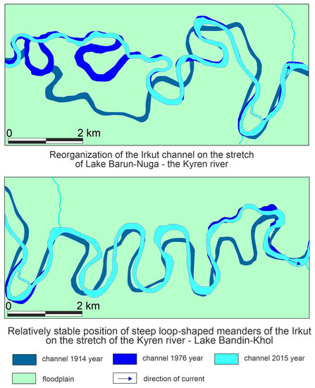 Channel processes in these basins vary widely. Natural processes, including the aeolian migration of matter, have an active influence on their course [46]. To determine the influence degree of the geological and geomorphological structure of the territory, hydrological conditions, and natural processes of channel development on dynamics of channel deformations, we analyzed the morphological changes of channels of the Lena river (upper course and flat-platform part) and Irkut (Tunkinskaya depression, Baikal rift zone, and the Irkutsk-Cheremkhovo plain of the Siberian platform in the lower reaches) over a 100-year period.