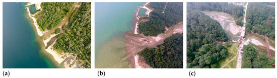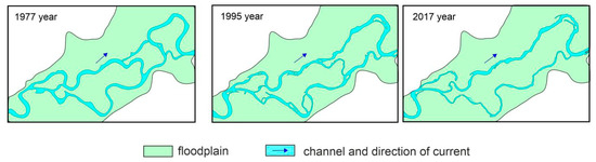 The analysis of different time images identified the most mobile stretches of the channel within the lowlands of the Irkut river [48]. In two cases, these are floodplain braiding with meanders in the left and right binnacles connected by minor by-channels. Another stretch is the meander in the right binnacle, complicated by the development and dying of by-channels. The main types of horizontal deformations of channels were revealed: In space, these are the forms of local (reformation of meanders) and local (changes within the elements of meanders, dying of transverse by-channels in floodplain braiding, an increase and decrease in the area of islands, caving and accretion of the banks) levels (Figure 10).