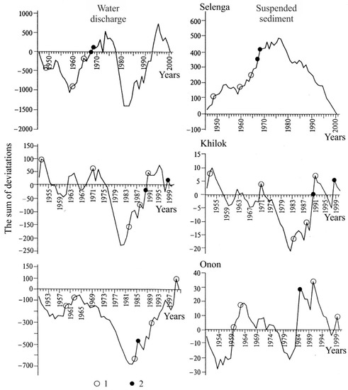 In the Selenga basin, an increased river water content and intense basin erosion were observed in 1959–1973 and 1984–1995. Although, the extreme development of erosion processes did not occur in the second period due to a sharp decrease in economic activity in the basins of several rivers in Buryatia, which was reflected in the graph of the difference–integral curve of suspended sediment of the Selenga (see Figure 11).