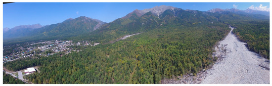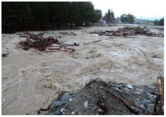 During the flood (August–September 2019), the activation of slope processes was recorded, which were most extensively and extensively manifested in the mid-mountain and foothill areas of the East Sayan uplift [70]. The steep slopes are indicative in this regard, where various slope processes have developed. In the upper parts of steep slopes, mudslide formation was recorded; in the middle parts they were joined by the processes of caving. In the lower parts of the slopes interacting with the river flow, a sufficient amount of slope material initiated the formation of a skeletal floodplain.