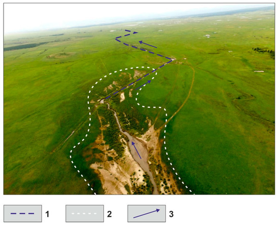 The density of gullies in the catchment area of the Kuitunka river (Selenginskoe Highlands) in thick loesslike sandy loams, for example, is 390 units/km2. In forest-steppes, gullies reach their maximum proportions (in loess-like sediments, their length is up to 4–6 km, depth: 20–30 m; in sandy sediments, their length is up to 1 km, depth does not exceed 3–5 m). On the terrace of the Onon river between the villages of Ikaral and Ust’-Borzya, there are 16 large linear gullies with a length of up to 800 m and a depth of 5 m (Figure 7).