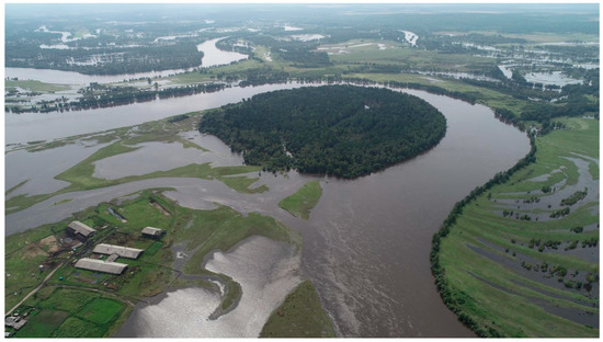The flooded negative forms of the floodplain topography of the broad floodplain section of the Iya river (the village of Gadalei). Coordinates: 54°24′27.4291″ N, 100°43′23.1787″ E. The image was taken on 2 August 2019 (second wave of the flood in 2019).
