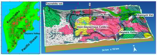 - Leonov, V.L. Geological Structure and History of Geysers Valley. In The Valley of Geysers—The Pearl of Kamchatka (Scientific Guide); Petropavlovsk-Kamchatsky: Kamchatpress, Russia, 2009; pp. 45–51. [Google Scholar]
