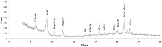 The mineralogical components of the clay fraction resulted to be mainly Mica, Chlorite, and Quartz, and Amphibole and Albite were also detected (Figure 1). Energy Dispersive X-Ray Spectroscopy highlighted the presence of the chemical elements listed in Table 2.