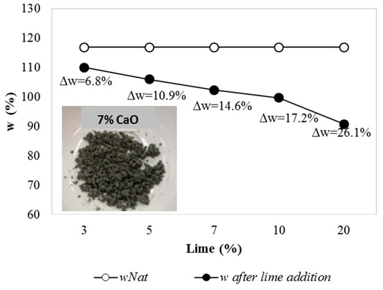 For lime-stabilized soils, the first criterion to identify the optimum lime amount is the evaluation of the ICL value (Table 1), that is the minimum lime percentage to start pozzolanic reactions and, therefore, the lowest content of lime to be considered. However, a lime percentage equal to ICL +1%–2% is typically investigated when designing lime-treated soils as the minimum one to ensure the development of long-term (i.e., pozzolanic) reactions, considering the variation in the chemical composition of a natural material such as a soil. The second followed criterion is not commonly considered in the conventional practice but was conceived for the specific soil of concern: the treatment effectiveness can be negatively influenced by the very high natural water content and, therefore, the ability of quicklime to reduce the water content, w, should be investigated in such case. To this end, different amounts of lime were added to the soil at wNat and the reduction of water content after lime addition was measured. Figure 2 shows the water content reduction as a function of the amount of lime added. The amount of 7% of quicklime turned out to be a good compromise between costs and advantages in terms of drying effects and workability. Workability was assessed by visual inspection: friable clods of the soil–lime mixture (image in Figure 2) did not show any loss of consistency when manually remolded. In the present research phase, 7% was selected as the minimum amount of lime to be investigated in the geotechnical experimental program.