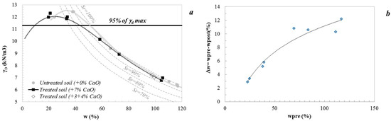 The reduction in water content due to lime treatment for all the compacted samples of the present experimental work is shown in Figure 3b, where ∆w, calculated as the difference between w before (wpre) and after lime addition (wpost), is plotted against the initial water content (wpre). Results show that the higher the initial w, the higher the reduction in w expectable with the binder addition.