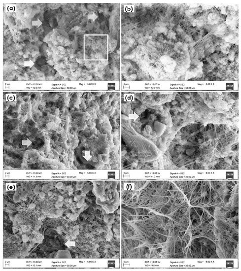 Early pozzolanic products are detectable at 2 days of curing (Figure 5a,b), turning out to be uniformly distributed across the entire sample. We detected two different morphologies of reaction products in the treated samples: calcium silicate hydrate (CSH) in a gel form that coats particles causing the spongy appearance and CSH in crystal form (acicular structures). The growth of crystalline pozzolanic products continues with the curing of sample (7 and 28 days in Figure 5c,d,e,f, respectively) with acicular structures that reach 10 μm in length at 28 days. EDS performed on pozzolanic products (area in the white rectangle in Figure 5a) confirmed the presence of Calcium and Silicon as main elements.