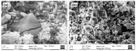 SEM images of precipitated octahedral calcium carbonate (a) and cubic calcium carbonate (b) in soil treated with 7% CaO, compacted at optimum water content.