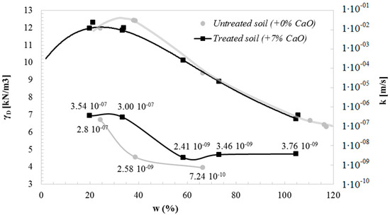 Moisture–dry unit weight relationship, Proctor plane (left y-axis), and long-term permeability values (right y-axis) for untreated compacted soil and for soil treated with 7% CaO.