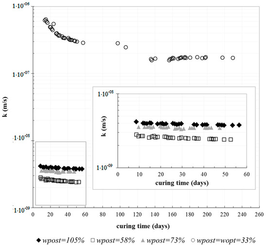 On the contrary, the hydraulic conductivity trends with curing time of the lime-treated samples compacted wet of optimum (w > 55%, Figure 8) show no reductions. This corroborates the hypothesis that the effects of high water contents on hydraulic conductivity prevail on soil–lime reaction effects, even increasing the curing time.