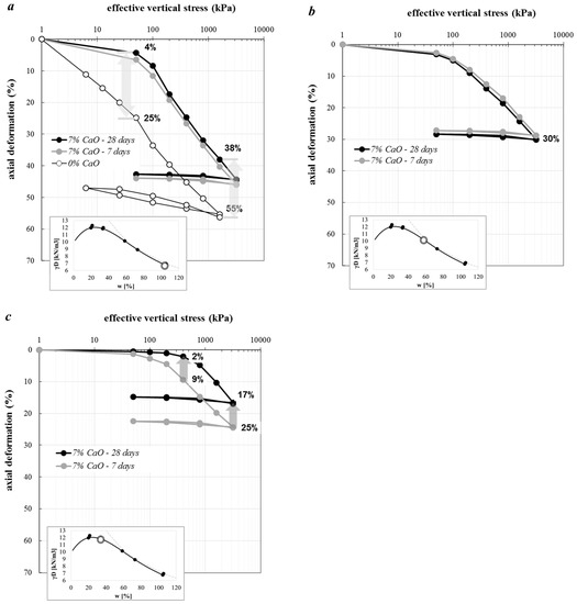 Figure 9 shows the results of the one-dimensional compression tests performed at 7 and 28 days of curing on specimens of different water contents; for each of the compressibility curves of the treated samples, the corresponding position in the Proctor plane is shown. The compression curve of the compacted, untreated soil at w = 100% (closed to wNat) is also displayed in Figure 9a, where the significant reduction in compressibility caused by lime treatment can be immediately noticed.