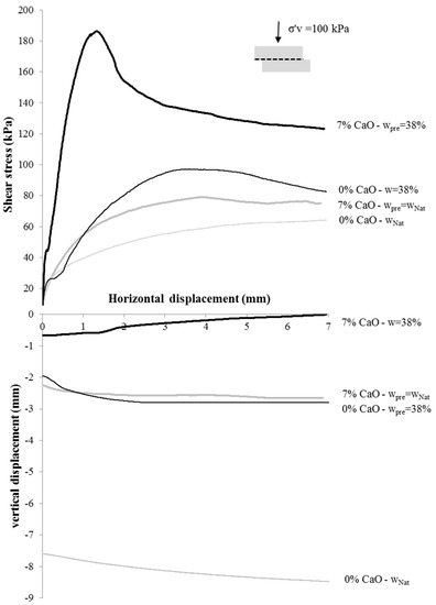 The shear strength parameters (plotted for a vertical pressure interval of 20–100 kPa, carried out at the same conditions), are represented by a cohesion of 14 kPa and a shear resistance angle of 35°. The double step of lime addition, if compared with the single supply of binder at the same initial w (natural water content), allowed for an evident increase in the cohesion (14 kPa instead of 2.5 kPa—see Table 3), whereas it did not seem to appreciably influence the shear resistance angle. As for the other specimens prepared starting from wNat, the shape of the stress-displacement curve is that typical of normal consolidated soils.