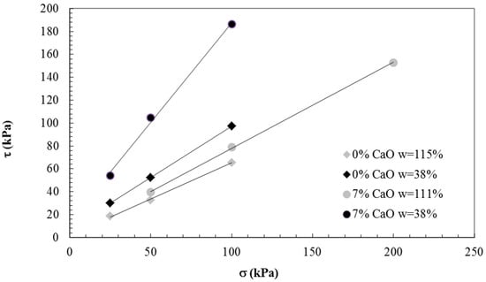 Before discussing the shear strength parameters, it is important to point out the peculiar behavior of the soil–lime mixture, i.e., artificial materials characterized by a soil fabric resulting from chemical reactions. As discussed in Section 1.2, aggregation causes an apparent modification in grain size distribution, switching from clayey soil into a coarse, cemented, grained material.
