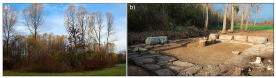 The first archaeological excavations began between the end of the 19th century and the first twenty years of the twentieth century [64,65,66]. The main buildings in the centre of the Roman city (cardo and decumanus, the thermaes, the civil basilica, the capitolium, the temples and some private houses shown in Figure 5 and Figure 6) as well as three medieval churches were brought to light.