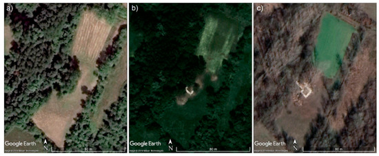 Mjace: Google EarthTM satellite images prior (a), during (b) and after (c) archaeological excavation.
