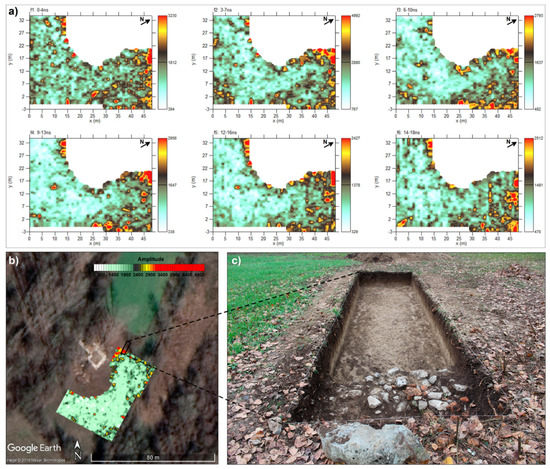 Figure 4a shows the most superficial time slices in the range 0–18 ns. The maps of amplitude put in evidence a situation of complete uniformity except for some high spots (with amplitudes major than 3000) with an irregular shape in the northern corner of the investigated area. The opening of a 2 × 8 m excavation test (Figure 4b,c) by the Centre for Conservation and Archaeology of Montenegro brought to light at that point an agglomeration of small stones and broken bricks. It was interpreted as the probable superstructure of the foundation. The absence of high values for the amplitude of electromagnetic signals elsewhere, despite disappointing expectations, allowed for direct checks to be concentrated only in the points promising truly profitable results from an archaeological point of view.