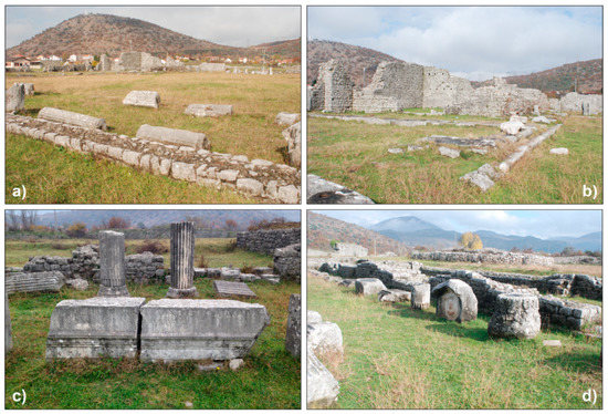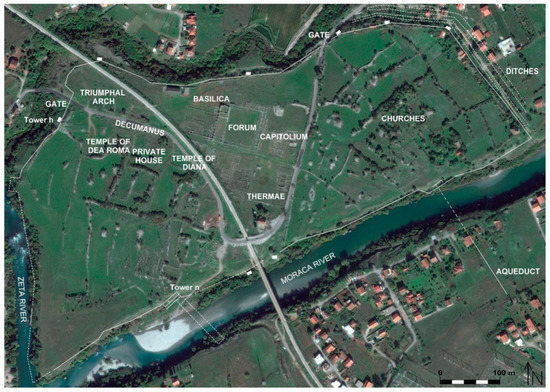 The Roman city of Doclea is located close to Podgorica, the modern capital of Montenegro, on a flat lowland where the river Zeta joins the river Morača (Figure 5). It was an important urban centre in the Roman province of Dalmatia (I-III century A.D.) and the capital of the province of Praevalitana (II-V A.D.). It was probably abandoned during the fourth century when the Christian churches in the southern sectors were still in use. Later the city was siege of an Episcope but, until now, no trace of the late antique/early medieval town was found, with the exception of the three churches already referred to [62]. Though naturally protected by rivers that surround the city on three sides with deep and wide riverbeds, its urban area that covers an area of 25.4 hectares was also fortified with strong walls [63]. While the part of the perimeter that bounds the rivers was constructed with not very massive walls, the north western, northern, and north eastern parts of Doclea were fortified with vertical walls, 2.20–3.70 m wide, with rectangular towers on them.