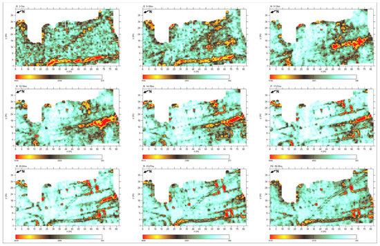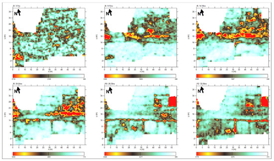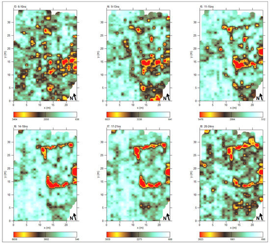 For the sake of brevity, Figure 7, Figure 8 and Figure 9 show only the sequences of three examples of slices processed at various time windows, respectively for the southern areas of the private house and the temple of Diana and the northern zone of the capitolium (1–3 in Figure 10). The maps show a very clear regular distribution of amplitudes of the electromagnetic signal, especially in the time range 14–21 ns. Square shapes and linear traces suggest the presence of archaeological structures buried in the subsoil with a good degree of certainty.