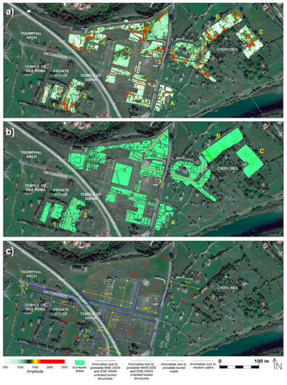 Figure 10 reports the uploaded results of investigation respect previous works [75] with the new and unpublished data obtained in the eastern part of the thermae (A in Figure 10) and around the medieval churches (B and C in Figure 10). The map reports the time slice relative to the time window of 14–18 ns. Here, an interpretation of results is attempted and the plan of probable buried walls is given (Figure 10b,c).