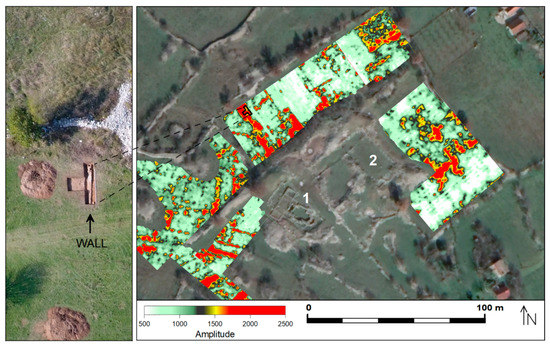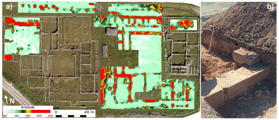 In the western area of the medieval churches, high amplitude values (in green in Figure 10b, Figure 11) are sparser and their distribution changes direction in the space (NNW-SES, WSW-ENE) with respect to the other areas. This may prove that, near the limits of the wall circuit and far from the public area, the concentration of buildings could have been lower. In 2018, an excavation proved the existence of a wall dated to the second century in the exact location expected by the geophysical investigation (Figure 11).