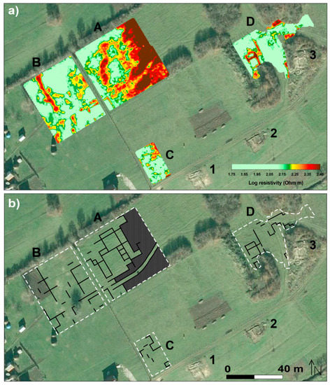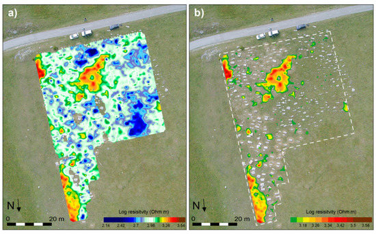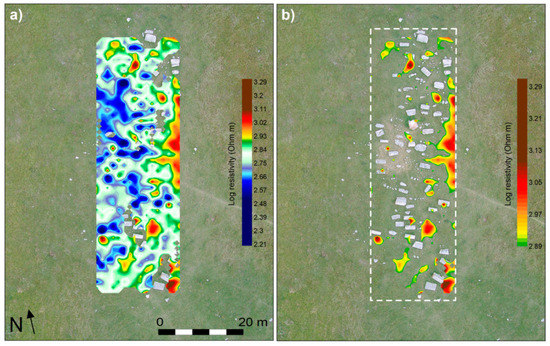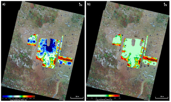 Figure 17 shows the imaged resistivity maps relative to 1 m in depth for the surveyed area. In Figure 17a, a graphical representation was realized using a colour scale according to which the subsoil zones with lower resistivity are displayed through the shades of blue, on the contrary with shades of red the areas with greater resistivity are represented. The existence of conductive areas, as in the central and northern part of the structure, depicts a non-vanishing probability to find ancient remains as it could potentially represent depressions and anthropic cavities filled with sediment or traces of burial pits. In Figure 17b, low resistivity values were coloured with a uniformed green shade in order to put in evidence resistive targets that can be attributable to potential remains of built structures. The main features are signed using dot lines.