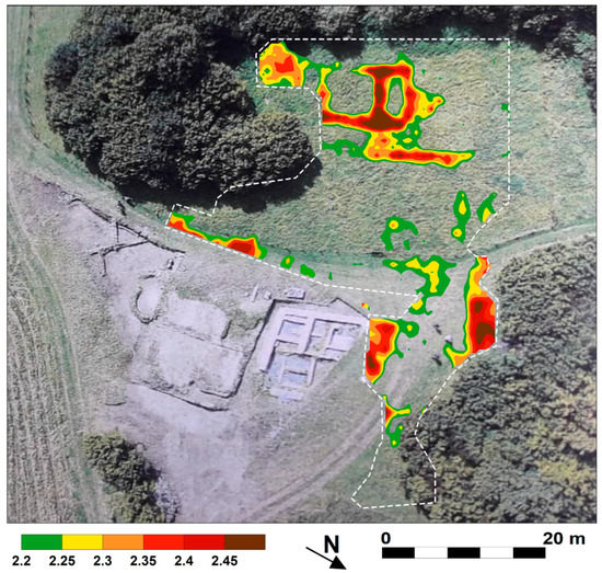 An archaeological excavation carried out during 2012 led to the identification of a large structure of dimensions 40 × 32 × 45 m, a probable palisade wall that covers a post monastery cemetery [82]. On the north part, the structure is about 7 m narrower, which gives impression that it has a mild trapezoidal shape (4 in Figure 15).