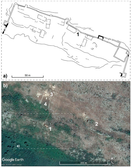 Svač: the upper town plan modified by [82] (a), buildings 1, 2, 3 reported in Figure 16 and the surveyed area (4) on a Satellite image of Google EarthTM (b).