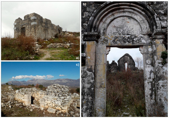 The medieval town of Svač is located 20 km northeast of Ulcinj, on one of the reefs of Šasko Hill. According to a legend, Svač owned as many churches as the number of days in a year, however today many of them are in ruins and only eight have survived. The city was organized in the upper town, the suburbs and the southern part according to the spatial disposition (Figure 15). Remaining buildings are in very bad state: cracked, demolished, and overgrown with plants (Figure 16) [82].