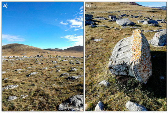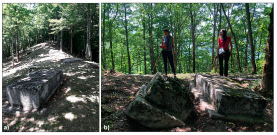 Mjace is located in the area of Skadar Lake (Figure 1), a place that always provided good living conditions as attested by numerous archaeological traces discovered in the valley: the prehistoric caves of Vezačka and Dujevska; the prehistoric tumulus of Debele, Palićeva, Gornji Vukovci, Odžina glavica, Vuksan Lekići; the urban settlements of Djuteza, Ponari, Samobor, Oblun, Livari, Besac; the enstablished agglomeration of Stari Mataguži; the medieval necropolises of Šinđon, Mijela, Plavnice and Grabe; churches and monasteries as Sv. Luke, Nikoljcrkve, Sv. Petke, Trojice, Skupo, Jekse, Manastira Ćelije, Koma, Presvete Krajinske, Starčeva, Moračnika; fortifications as Lesendro, Grmožur, Tophala, Kulica and Balšinog [57]. Considering the importance of this region with its heterogeneous content, in 2017, an archaeological survey started at Mjace (Figure 2a and Figure 3), in Mataguzi, taking up an excavation realized in the 1980s led to very significant results [58]. This location reopened the search for a possible centre of the Illyrian state of Donja Zeta, built by Illyri Labeati, on toponymic and linguistic suggestions and the accuracy of data from historical sources [59].