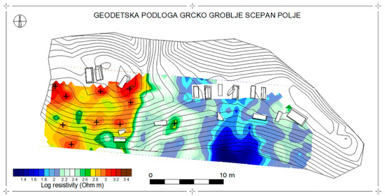 ERT was successfully applied for archaeological investigations [39,40,41,42,43]. The parameter on which it is based, the electrical resistivity, allows for the recognition of common archaeological structures as the presence of accumulated tiles, stonewalls, building foundations, or cavities immersed in a conductive hosting soil are usually attested to by high resistivity values.