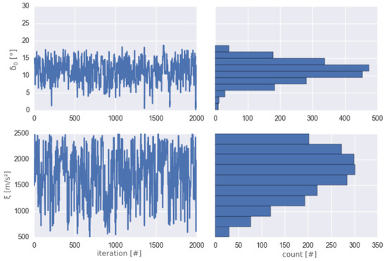 The acceptance rate, i.e., the fraction of accepted and proposed elements, of the investigated scenario is 0.48. This means that 967 parameter combinations (candidates) were accepted and added to the resulting distributions (Figure 1). The mean values of the distributions are and , which fit in the range of corresponding values found in the literature (e.g., [14,42,43]).