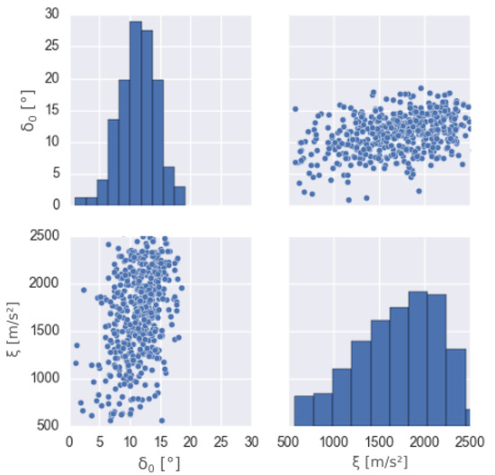 The input–output model is a combination of the avalanche simulation tool r.avaflow [9] and an evaluation of the simulation results in a path dependent coordinate system [10], which allows one to define simple evaluation criteria. The tool r.avaflow includes different flow models: a single-phase model for solid flows and a two-phase model additionally considering solid fluid interactions. The friction relation in the latter is represented by a classical Voellmy friction [13,14] or a modified approach to account for random kinetic energy [15]. In this work, we choose the one-phase flow model with the Voellmy friction model defining the set of process model parameters . The friction angle (or Coulomb friction coefficient ) and the turbulent friction coefficient are the determining parameters of the basal shear stress , which depends on the normal stress and the velocity u, , with the gravitational acceleration g. The appropriate parameter ranges of each model parameter can be constrained by various approaches. Physically relevant ranges [16] may be useful, but also experimental work [17], existing guidelines and literature [14,18] or prior knowledge based on back calculations [19] can be utilized. Based on these values and in order to avoid any a priori restrictions on the possible parameter combinations [11], we choose the rather large intervals of the single parameters to be , resp. and .