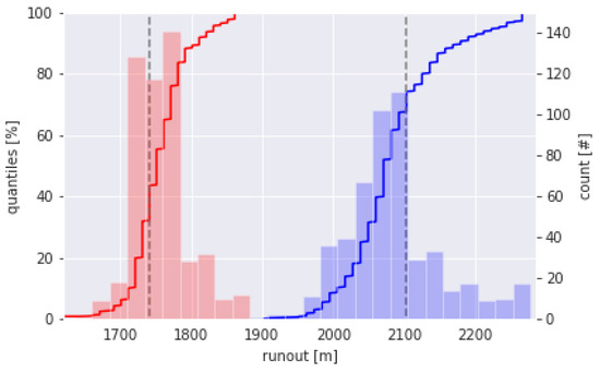Runout statistics of the forward and predictive simulations with the Monte Carlo sample (, ) for the Kerngraben (red) and Wolfsgruben (blue) avalanche with the observed runouts (dashed black line). Solid lines (red, blue) depict the quantiles of the resulting runout distribution and transparent bars the corresponding histograms. The observed runout for the Kerngraben avalanche is 1741 m, with the 95–5% quantiles ranging from 1701 to 1831 m and 2103 m for the Wolfsgruben avalanche with a range of 1985m to 2233m for the 95–5% quantiles.