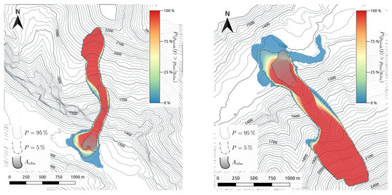 For any location, the map displays the probability to be affected by the avalanche simulation, conditional on the observed data . The conditional runout probabilities differ from approaches in, e.g., Straub and Grêt-Regamey [8], where the annual probability distribution of the run-out distance is conditional on deterministic model parameters or probabilistic measures, such as impact indicator index [47] with their direct dependence on the observational data.