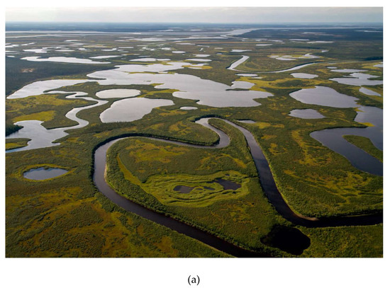 Natural gas emission often occurs from the bottom sediments of thermokarst lakes that are produced by the thawing of ground ice [36] and thermal erosion. Such thermokarst lakes cover large areas and create a particular landscape in Arctic lowlands in Siberia (Figure 1).