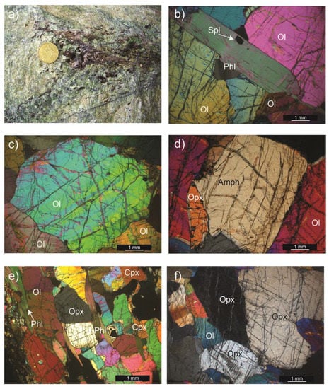 Petrographic and microstructural features in the coarse-grained ultramafic samples of the Ph-Pd unit (crossed polarizers). Mineral abbreviation after []. (a) Harzburgite at mesoscopic scale: pocket with large flakes of phlogopite (dark-brown), olivine (pale green), Cr-diopside (emerald green), and pargasite (dark spots); (b) Typical phlogopite (phl) elongated grain surrounded by olivine (ol) crystals in dunite (17); (c) Very coarse olivine grains with polygonal, equiaxed shape in dunite (17); (d) Very coarse amphibole grain with polygonal shape surrounded by olivine crystals in harzburgite (20C); (e) Mineral assemblage characterized by rounded crystals of orthopyroxene, olivine, and elongated phlogopite crystals, which mark the foliation in lherzolite (08B); (f) Anhedral orthopyroxene grain with cusp-like terminations in harzburgite (24C).