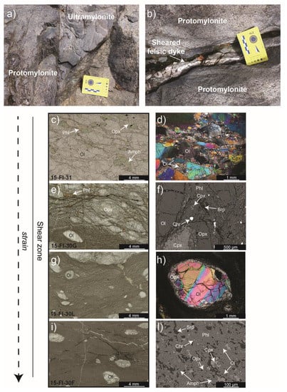 Shear zone macroscopic, petrographic, and microstructural features: (a) outcrop picture showing the textural variation from proto- to ultramylonite; (b) sheared felsic dyke within protomylonites; (c,e,g,i) Clippings of thin section natural light scans, the white box locates the higher resolution images presented on the right; (d) Cross-polarized light photomicrographs of protomylonitic harzburgite (31) characterized by elongated olivine and pyroxenes porphyroclasts surrounded by anastomosed seams of a fine-grained matrix; (f) Back-Scattered Electron (BSE) image of the mylonitic texture (30G); (h) Undulose extinction in a olivine porphyroclast surrounded by orthopyroxene recrystallized grains in the ultramylonite (30L); (l) BSE image of the ultramylonitic matrix (30F).