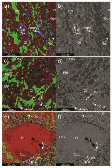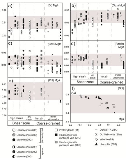 The forsterite content in olivine ranges between 89.5% and 91.5% (Figure 5a). The Mg# of orthopyroxene (Mg# = [molar Mg2+/(Mg2++Fe2+tot)]) ranges between 0.90 and 0.92 (Figure 5b). Clinopyroxene is diopside with Mg# ranging from 0.93 to 0.95 (Figure 5c). The Mg# of clinopyroxene is inversely correlated with its modal abundance, i.e., lherzolite and olivine websterite show the lowest Mg#. Amphibole is dominantly pargasite with Mg# in the range of 0.89–0.92 (Figure 5d), in the sheared peridotites it shows higher edenite component and, locally, higher Cr2O3 becoming chromium-pargasite. Phlogopite occurring both as large deformed flakes and small grains within the were observed between core and rim analyses nor between porphyroclasts and matrix-forming grains. However, the Mg# of olivine and orthopyroxene from the ultramylonitic sample with less porphyroclasts (30F) are slightly lower than those reported for other rock types (Figure 5a,b) and even lower than the compositional field defined by previous studies of the shear zone [,] and of the coarse-grained ultramafics [,].